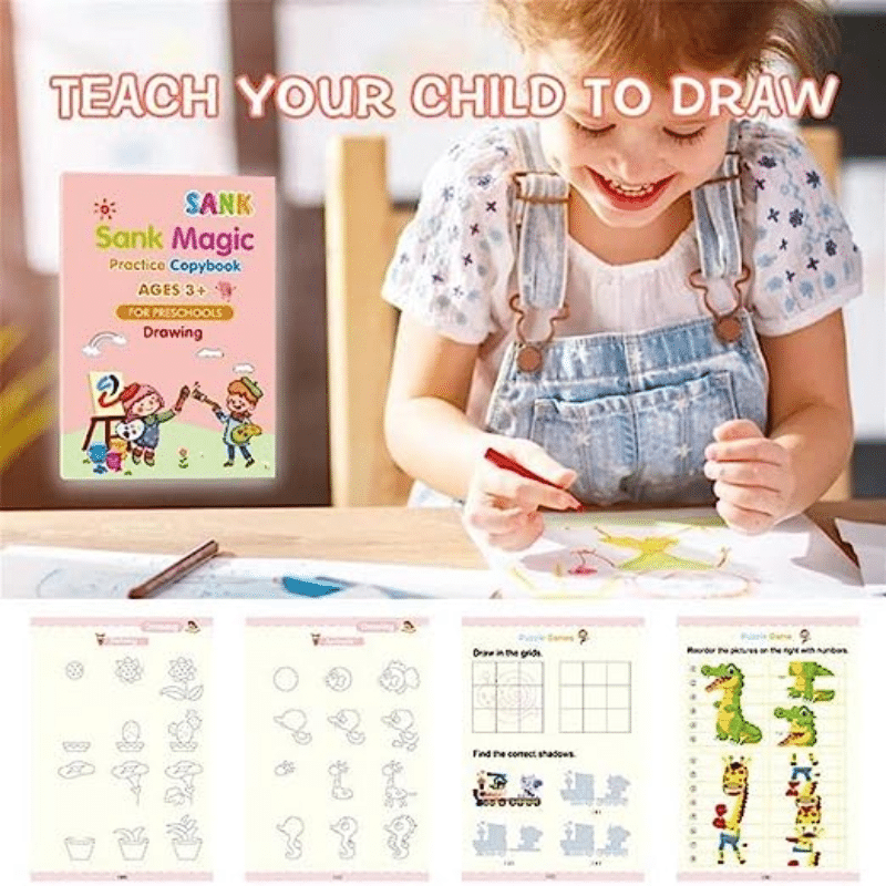 - 4 In 1 Large Magic Practice Copybook Set: If you want your children to learn calligraphy, Writing, painting, mathematics, English. A reusable magic copybook set is a must-have. This series of workbooks contains a wealth of exercises to help children develop the eye-hand coordination skills necessary for learning to write clearly.
